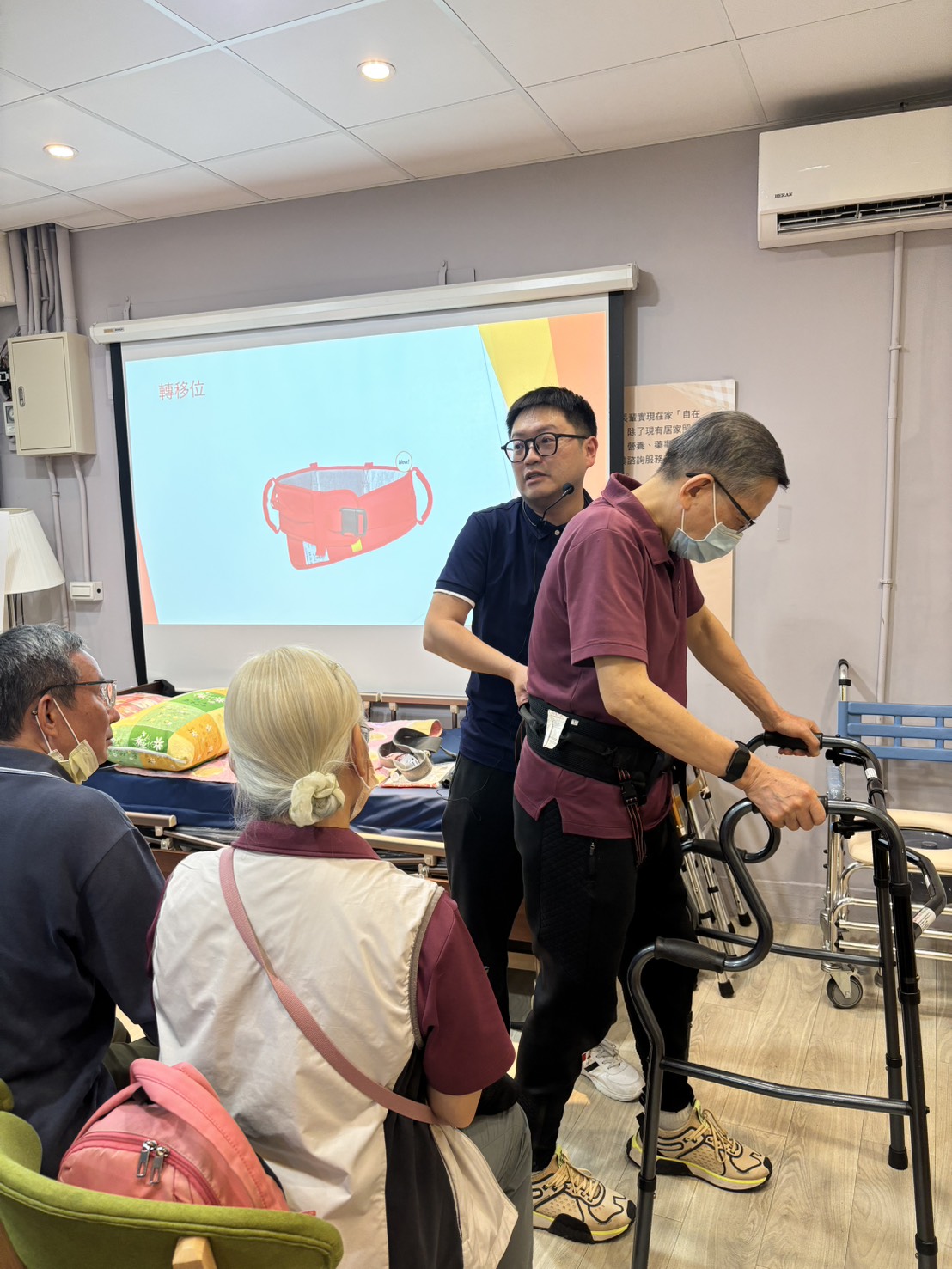 在本次培訓中,澄心康健的物理治療師針對居服員在居家環境中常遇到的挑戰,設計了一系列實作課程。現場中化銀髮的夥伴們佩戴工作證,專注地進行移位技巧、生活功能訓練的模擬演練。